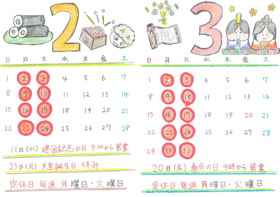 2026年2月の休業日 2日・3日・9日・10日・16日・17日・23日・24日